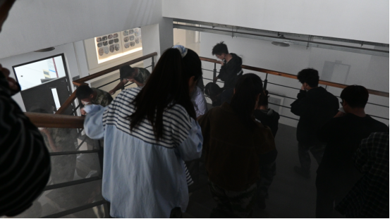 随着火警警报响起,模拟火灾现场考验正式开始。浓烟弥漫,能见度骤降,学生们迅速反应,按照所学逃生知识,捂住口鼻、低姿贴墙前行,有序撤离现场。整个过程仅用两分钟,充分展现了演练的实效性。