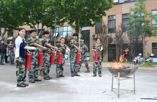 理论讲解后,课程进入实操环节。扈教官详细演示了灭火器的使用方法,并总结出“拔、握、站、压”的四字口诀。新生们在教官的指导下分组进行实操练习,通过模拟灭火操作,将理论知识转化为实际技能,显著提升了安全急救能力。